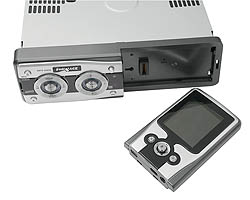 В плеере (который совсем недавно был половиной лицевой части головного устройства) есть свой ЧМ-тюнер (работает в верхнем диапазоне), у тюнера — 20 пресетов плюс автоматическое и ручное заполнение памяти — в общем, всё как «у больших». Заполнение имеющихся резервов памяти длится примерно 20 с, но старт всегда происходит в начале диапазона, а потому станции с частотами выше 98 МГц (по Москве) запоминать придётся вручную. Возможна запись на диктофон с радио. В настроечном меню 9 страниц, а число уровней — до 4-х. Возможно, по меркам плееров с их маленькими дисплеями это нормально, но по нашим привычкам — явный перебор. Всё управление осуществляется нажатием и качанием джойстика (только по горизонтали, даже когда надо прокручивать меню сверху вниз, к этому надо привыкнуть, что, впрочем, оказалось довольно просто) и ещё одной кнопкой. Для пользовательского интерфейса предусмотрено 14 языковых вариантов, русский, разумеется, в их числе. Только упаси вас господь выбрать, скажем, арабский (если вы не арабист со стажем): в меню языков приводятся не международные, а самоназвания, то есть — на выбранном языке. Между прочим, одна из заложенных в плеер функций — навигационная система, карта (географическая) должна быть загружена с внешнего носителя (SD или MMC), но это, видимо, для перспективных моделей, здесь GPS-приёмника нет. Звуком управляет пятиполосный эквалайзер с семью предустановками и центральными частотами 60/300 Гц и 1/3/6 кГц. При подключении по USB Mini к компьютеру происходит зарядка аккумулятора плеера, а компьютер его воспринимает как внешний диск на 256 Мб или как два диска, если установлена карта SD. Снимается плеер и устанавливается на своё место без проблем.