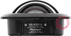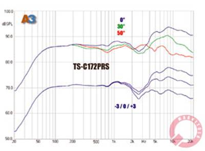 Твитер оснащается шёлковым куполом, диаметр которого составляет 30 мм. Внутри корпуса из металла инженеры разместили две воздушные камеры, соединенные каналом. При воспроизведении низких (для твитера) частот камеры работают как единое целое, что обеспечивает низкий уровень резонансной частоты, обуславливающий продление частотного диапазона вниз. Ещё более важным фактором является тот, что при таких частотах удаётся добиться снижения нелинейностей. Рост частоты приводит к тому, что работает лишь камера, которая находится ближе к куполу, что повышает добротность излучателя, а это в свою очередь создаёт возможность корректировки формы АЧХ на среднем верхе. Что касается корпуса пищалки, то он представляет собой «чашку», предназначенную для заглублённой установки. Комплект включает в себя подставку для монтажа пищалки на поверхность при угле разворота оси, составляющем 20/50 градусов. Данная подставка является стандартной во многих комплектах, но Pioneer TS-C172PRS комплектуется и парой необычных аксессуаров. Речь идёт о накладках, которые выполнены в виде скошенного рупора. Стоит отметить, что в инструкции к автоакустике рекомендации, когда (и для чего) следует использовать данные аксессуары, отсутствуют. Если следовать общим соображениям, то скошенный рупор даёт возможность сместить ось излучения, а также, скорее всего, добиться некоторого изменения формы АЧХ возле частоты раздела.