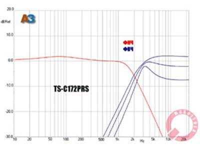 Далее можно посмотреть, каким решением оснастили свою акустику специалисты Pioneer. Частоту среза фильтра НЧ характеризует показатель в 1,65 кГц. При включении аттенюатора сильно возрастает показатель добротности характеристики фильтра ВЧ. При этом наблюдается снижение частоты среза от 3,0 до 2,35 и 1,8 кГц. Минимальная реактивность обуславливает показатели крутизны спада практически на таком же уровне, как у активных фильтров - 12 дБ/окт.